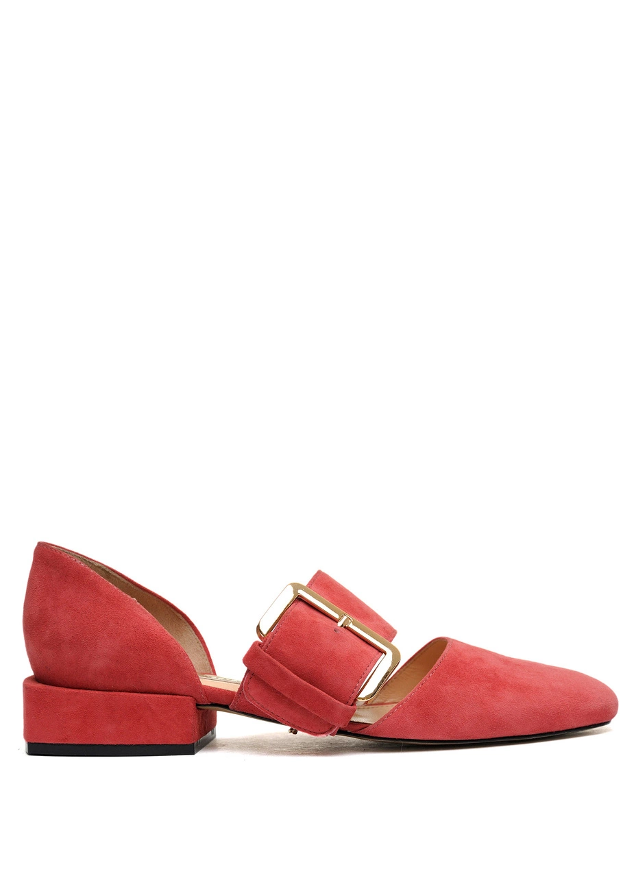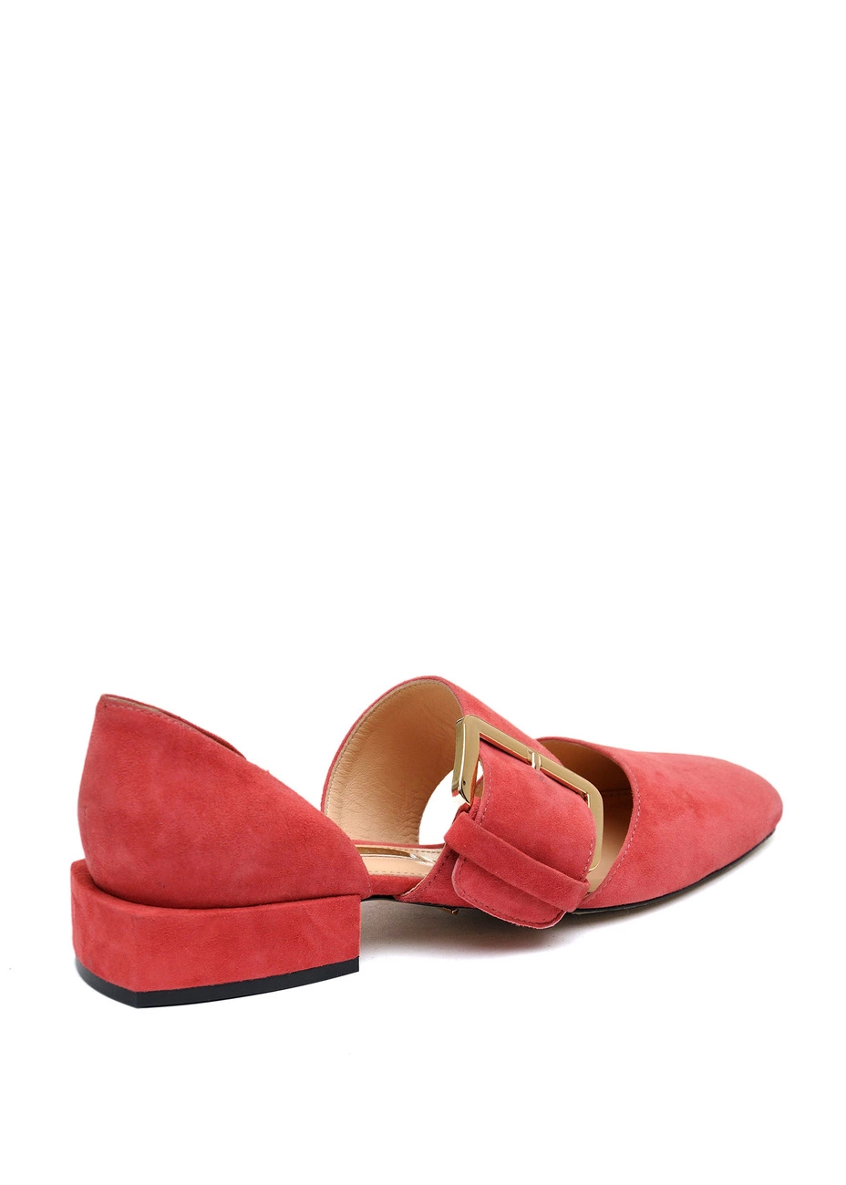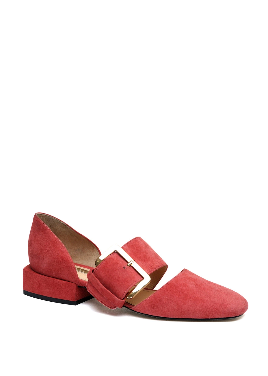 Балетки Modus Vivendi из натуральной замши кораллового цвета. Колодка большемерит. Высота каблука - 2,5 см.