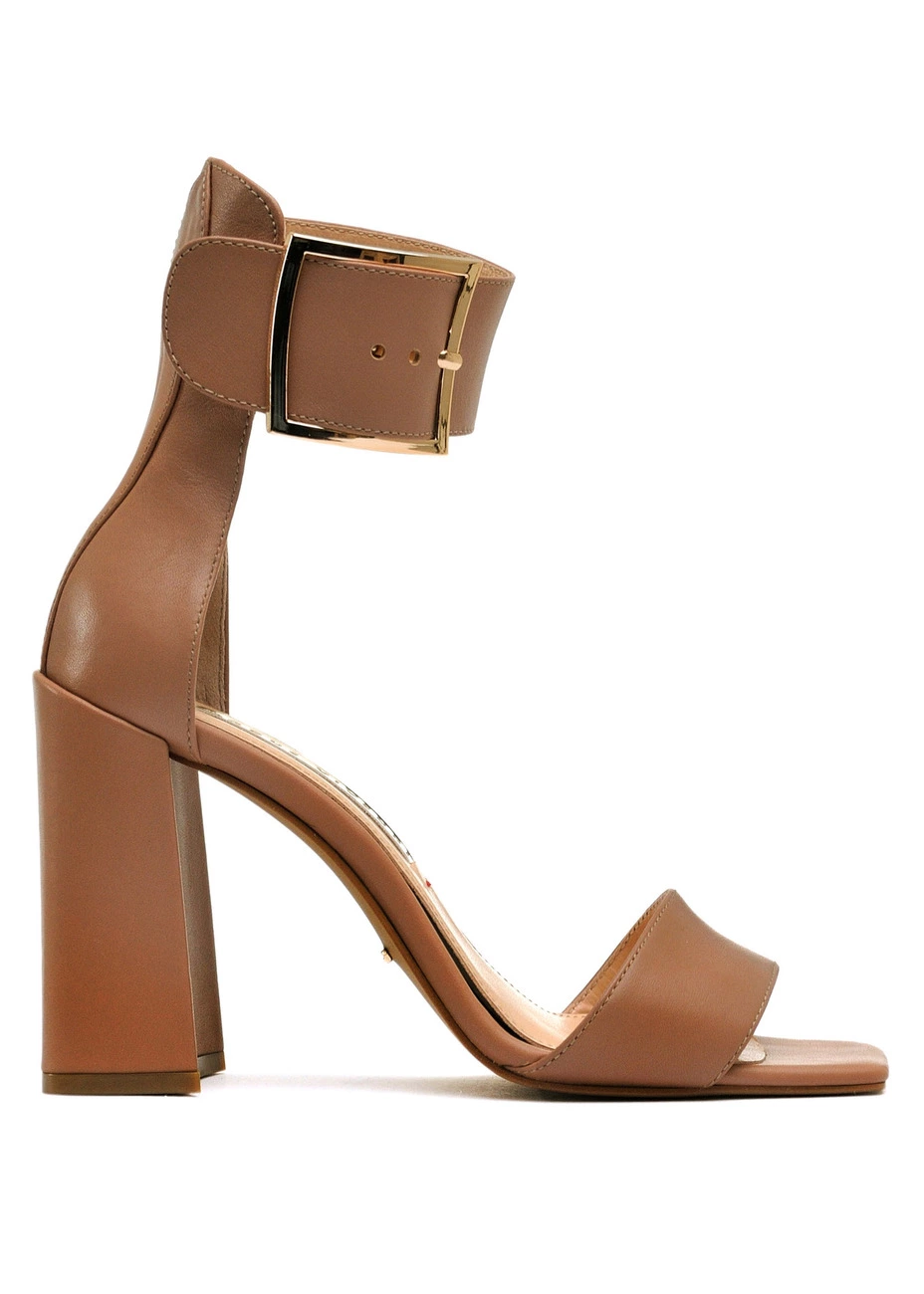 Босоножки Modus Vivendi из натуральной кожи карамельного цвета. Колодка стандартная. Высота каблука - 9,5 см.