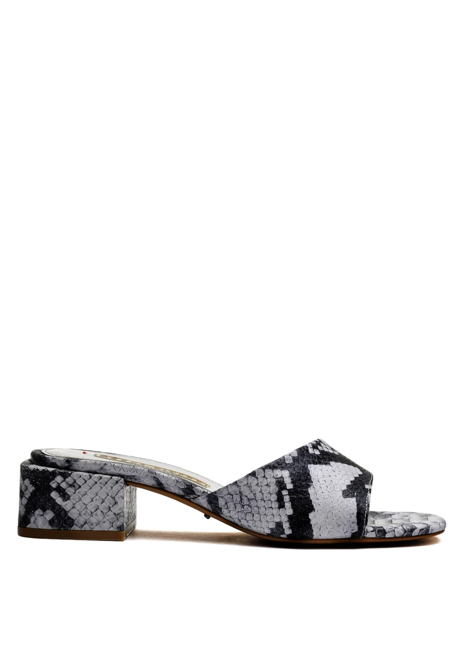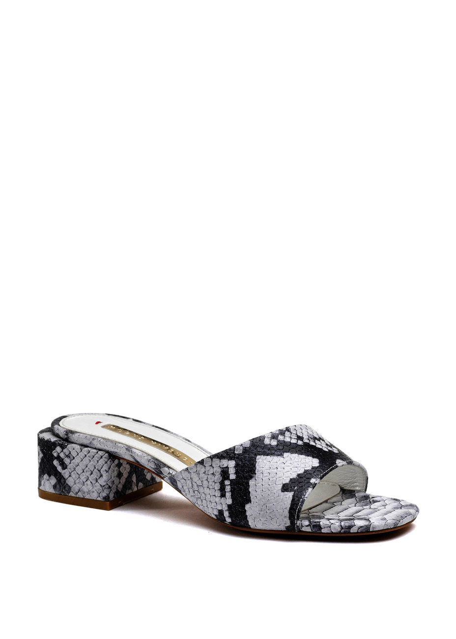 Сандалии Modus Vivendi из натуральной чёрно-белой кожи с тиснением под рептилию. Колодка стандартная, высота каблука - 4 см.