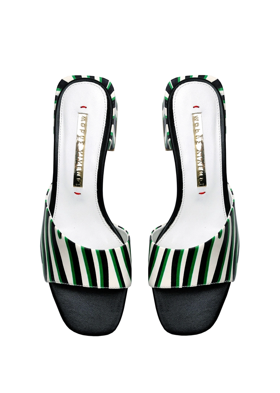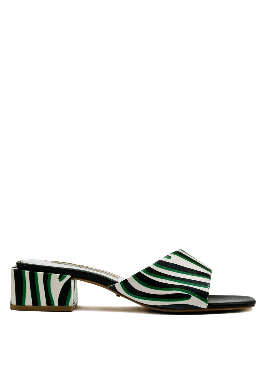 Сандалии Modus Vivendi из натуральной кожи с чёрно-зеленым принтом под зебру. Колодка стандартная, высота каблука - 4 см.