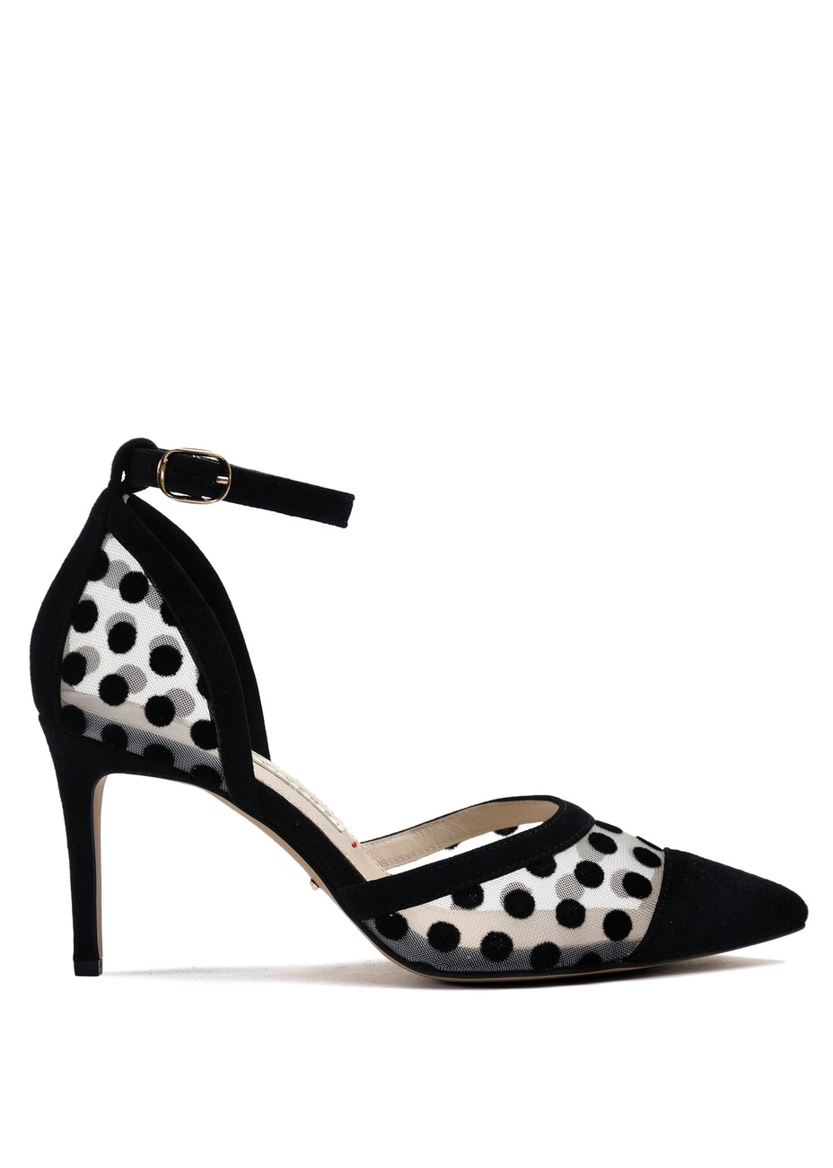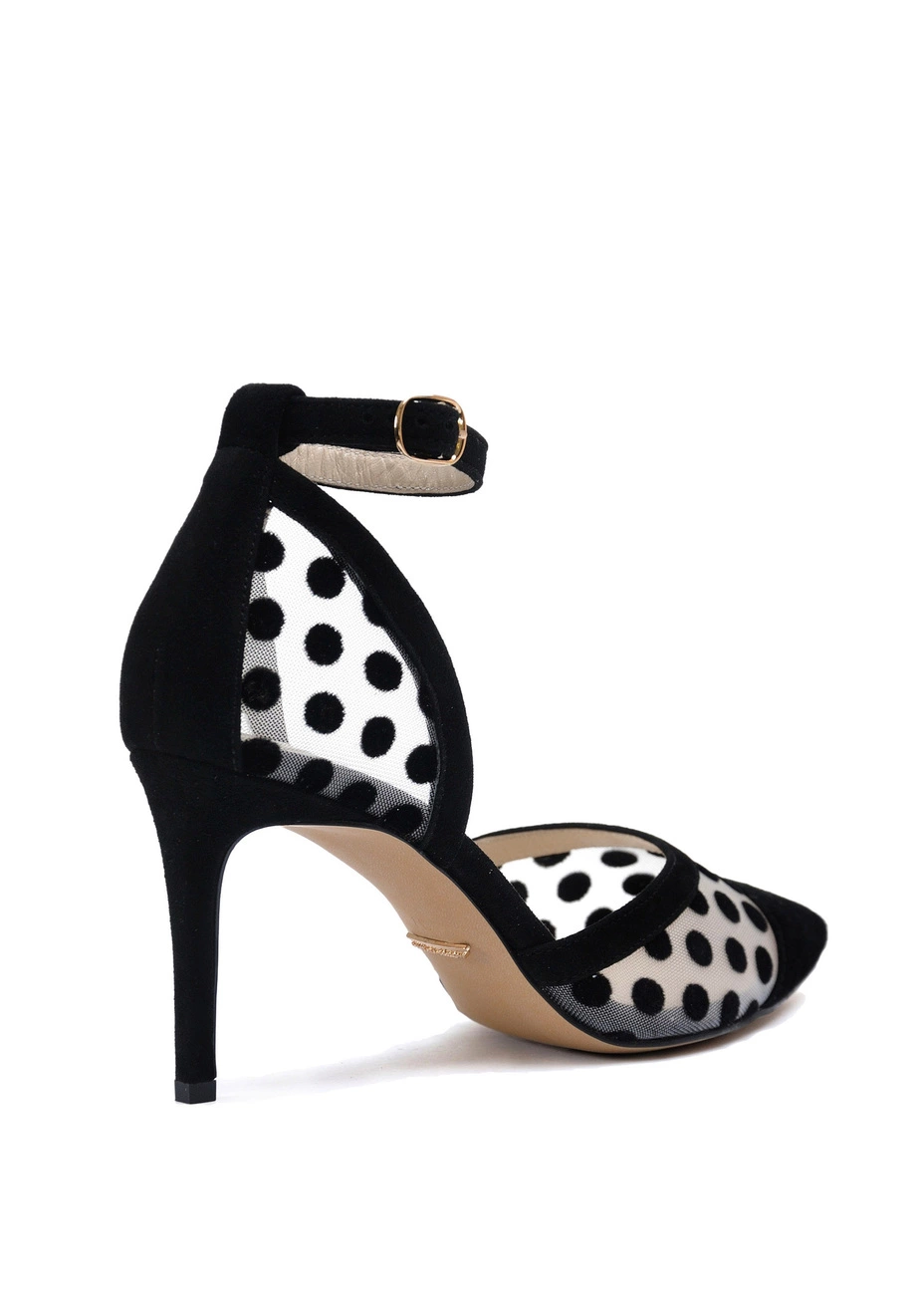 Туфли Modus Vivendi из натуральной замши чёрного цвета и сетки с чёрным горохом. Колодка большемерит. Высота каблука - 8 см.